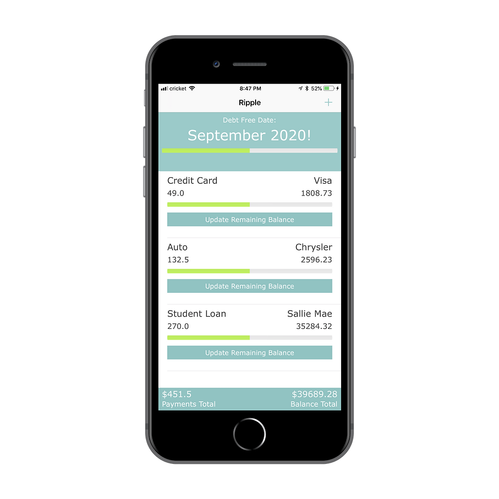 Create a list of all your debts and Ripple will sort them in the order you should pay them off from smallest to largest to produce a ripple effect. Ripple will help you choose a date you will be debt free by and encourage you along the way!
